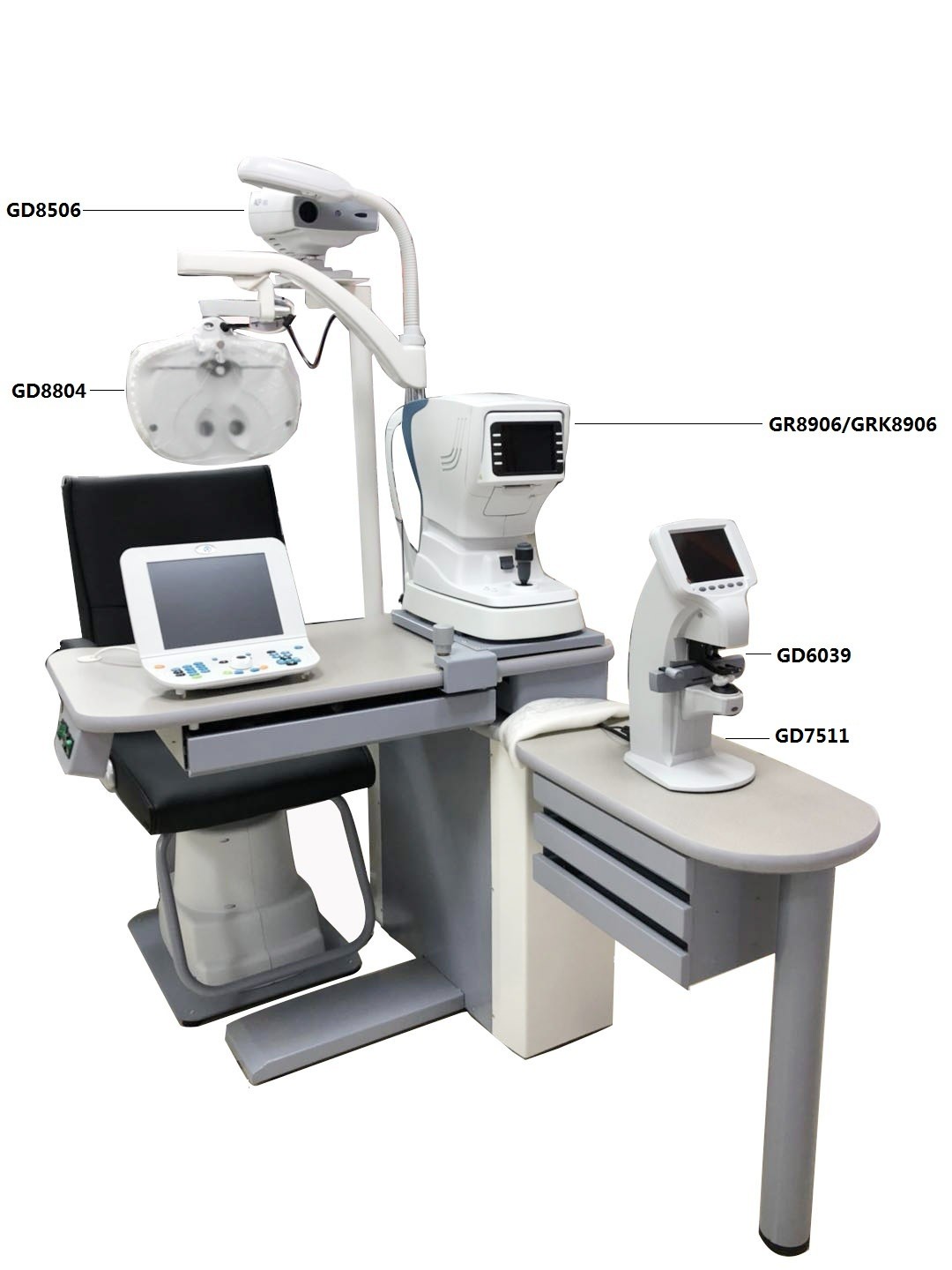 1. Unidad Oftálmica -GD7511: el brazo del foróptero puede subir y bajar, y ajustarse rotando; Una mesa adicional para colocar el lensómetro;